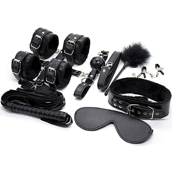 セット内容:縄、アイマスク、口枷、手枷、足枷、首輪、ムチ、クリップ、ティーザー、連結用十字ベルト