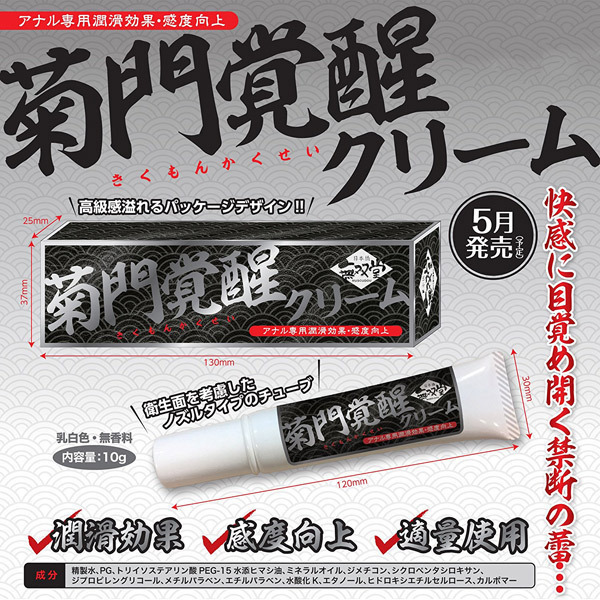 菊門覚醒クリームが新登場!潤滑と抗菌を両立した乳白色で無香料タイプのクリームで、潤滑効果と共に感度アップもサポート。